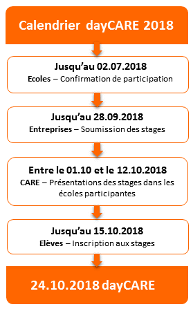 Le dayCARE est un outil parfait pour faire découvrir aux jeunes les entreprises, leurs besoins futurs et les perspectives qu’elles offrent. Pendant le dayCARE, le 24 octobre 2018, les jeunes effectuent un stage dans une entreprise et l’entreprise récompense leur engagement avec un don pour CARE qui assure la formation des jeunes sages-femmes au Niger et au Laos. Avec cette formule unique, le dayCARE réunit les motivations sociales et la curiosité des jeunes pour le monde du travail et arrive ainsi à mobiliser les jeunes proactifs, intéressés et engagés. Ensemble, les jeunes et les entreprises se confrontent à la nouvelle dynamique économique et s’engagent pour des valeurs humanitaires.